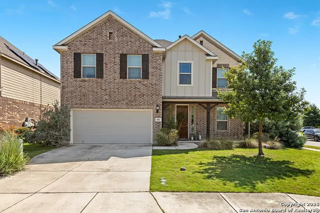 Move-in ready two-story home situated on a desirable corner lot. The front office provides an ideal space for working from home or studying. A spacious living room features custom built-ins and flows seamlessly into the large kitchen, complete with an island, abundant counter space, and ample cabinetry. A dedicated dining area offers plenty of room for a full-size table. The laundry room is conveniently located on the main floor. Upstairs, a versatile flex space provides additional room for a game area, media room, or second living area. The home offers four bedrooms, including a generous primary suite with a garden tub, separate shower, and walk-in closet. Thoughtful upgrades and stylish finishes throughout give this home a modern, elevated feel. Upgraded with hardwood floors downstairs. Close to Boerne and walking trails.