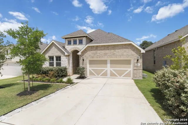 Welcome to this beautifully upgraded single-story 4-bedroom, 3-bathroom home tucked away in a peaceful cul-de-sac in the sought-after Regent Park community in Boerne. Built in 2022 by Brightland Homes, this 2,2218 sq ft single-story stunner offers modern comfort and timeless style. Step through a striking custom front door into a bright, airy layout with soaring ceilings, 8-foot doors, bold accent walls, and custom light fixtures throughout. The open-concept kitchen features 42" cabinetry, a large granite-topped island with breakfast bar, built-in appliances, and a natural gas range-perfect for cooking and entertaining. Cozy up around the custom electric fireplace in the spacious living room, or work in peace in the dedicated home office. The luxurious owner's suite boasts an oversized walk-in shower and a relaxing garden tub. Outside, enjoy a professionally landscaped yard with mature trees, a front and back sprinkler system, front gutters, both wrought iron and private wood fences, and an extended covered patio ideal for Texas evenings. Additional features include a reverse osmosis water system, a water softener, and a level-2 EV charger in the garage to meet your modern lifestyle needs. This move-in ready home combines elegance and functionality. Don't wait, so schedule your showing today!